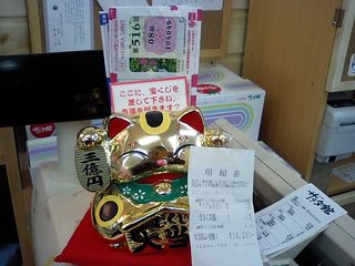 2007年02月22日 またまた… コメント数:0 コメント カテゴリ:シャディサラダ館 by ハートランドのとほほ店長 またまた、調子に乗って前回の当たるゴールドバンクで実験して当選(6000円投資で14600円当選)を思い出し、また柴又駅前の宝くじ売り場で6000円分を購入! おかげさまで、噂を聞いた方で4個も販売で、残り3個となりました (^-^)/ 頑張れ招き猫(ゴールドバンクねこ)