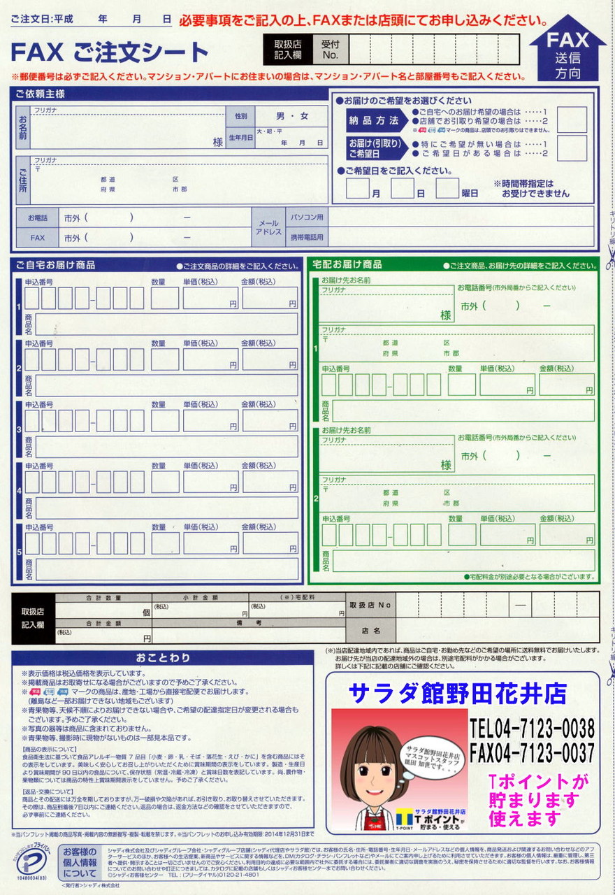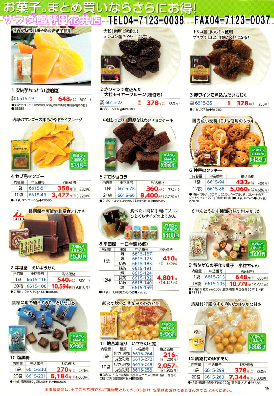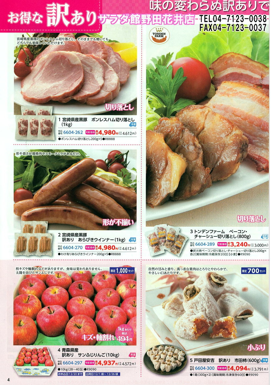 2014年11月26日 訳ありって・・・ コメント数:0 コメント カテゴリ:シャディサラダ館 by ハートランドのとほほ店長 今朝も冷たい雨です。。。昨夜は、イエロー号のエンジン不調!!プラグの交換で回復。。。これからの繁忙時期・・・良かった~助かった~今年のお歳暮は・・・なにやら早いスタート。。。それと相まって・・・ご自分用にと「おまとめ買い企画」も美味しくてお得なんです。。。 「シャディサラダ館」カテゴリの最新記事 タグ :#訳あり#シャディ#おまとめ#グルメ < 前の記事次の記事 > コメント コメントフォーム 名前 コメント 記事の評価 リセット リセット 顔 星 情報を記憶 コメントを投稿する