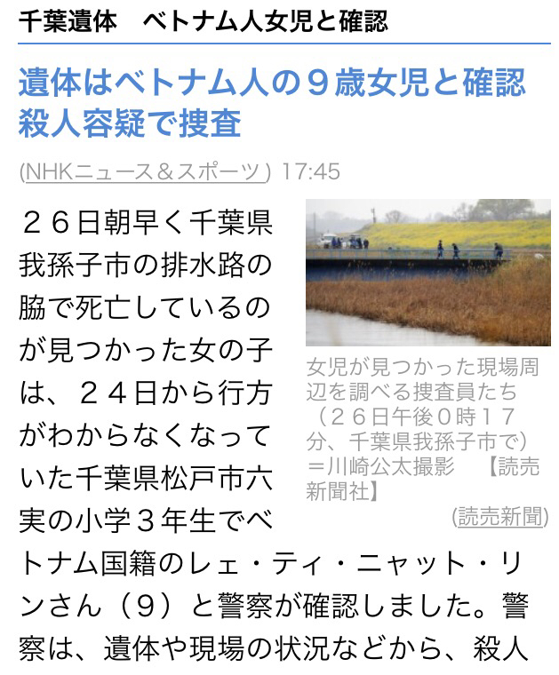 松戸東警察署からのお知らせです。3月26日午前6時45分頃、我孫子市北新田付近の排水路脇で、3月24日に登校のため松戸市内の自宅を出て以降、行方不明となっていた9歳の女子児童が遺体で発見されました。我孫子警察署で合同捜査本部を設置し、捜査中です。屋外での子どものひとり遊びは避け、見知らぬ人から声を掛けられたら、ついていかず、防犯ブザーを鳴らしたり、大声を出して近くの人に助けを求めましょう。なお、不審者を見かけたり、事件について心当たりのある方は、警察に通報してください。