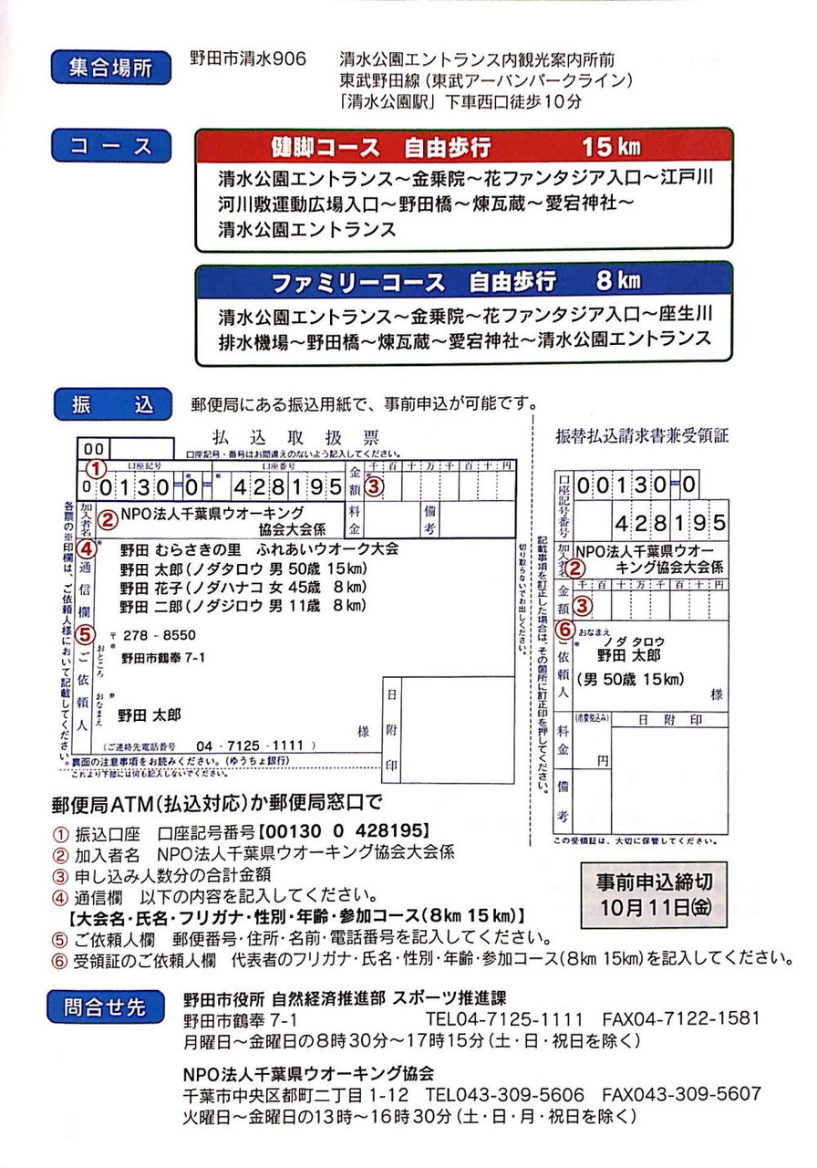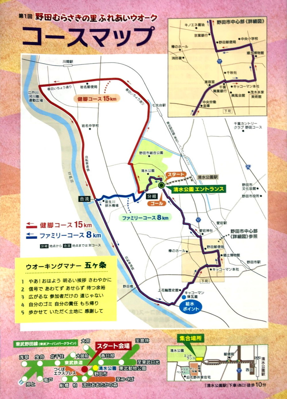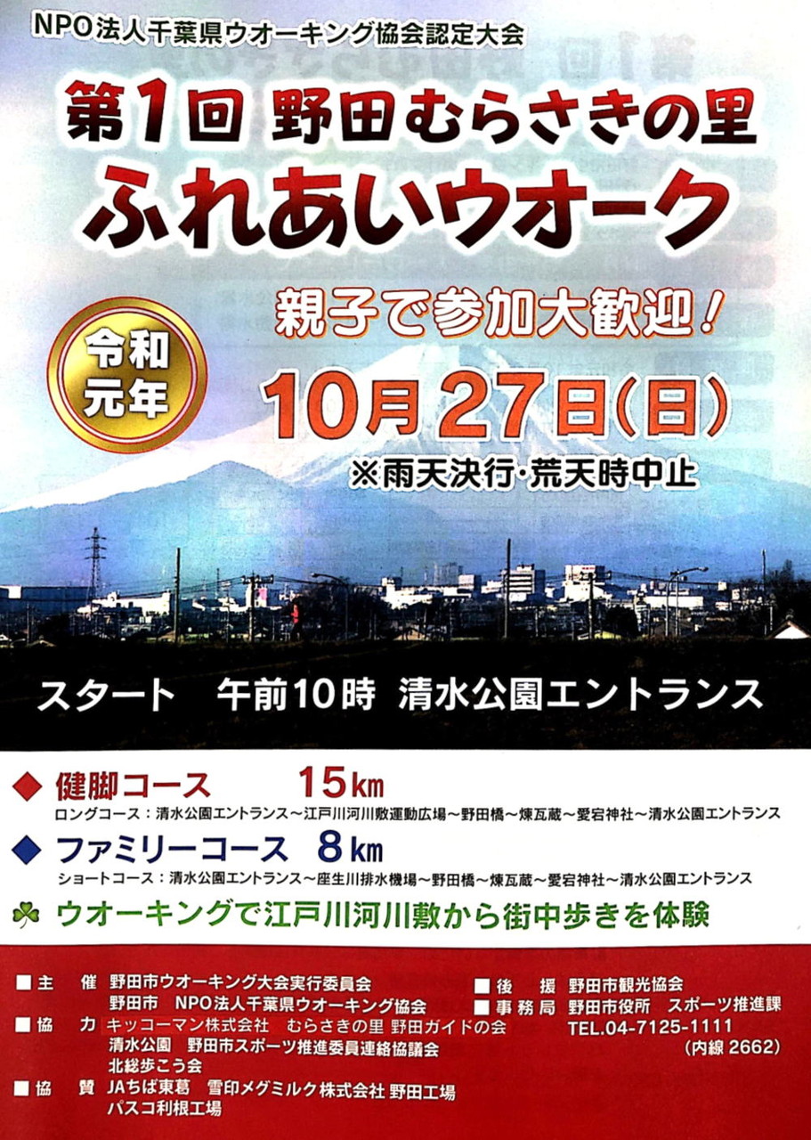 2019年10月05日 第一回・野田むらさきの里ふれあいウォークが・・・ コメント数:0 コメント カテゴリ:野田市情報掲示板!! by ハートランドのとほほ店長 野田市を歩き尽くせ~的な・・・第一回・野田むらさきの里ふれあいウォークが開催されます。歩くと色んな発見も・・・コースも健脚コース15km・ファミリーコース8km日時:2019/10/27 AM10時概要を良くお読みが参加ください。。。事前申し込みは・・・2019/10/11までです!コース図・・・野田市を歩いてみませう。。。秋の景色はどんなんだろう?! 「野田市情報掲示板!!」カテゴリの最新記事 タグ :##ウォーク##スポーツの秋##ウォーキング##野田市##江戸川##野田市情報 < 前の記事次の記事 > コメント コメントフォーム 名前 コメント 記事の評価 リセット リセット 顔 星 情報を記憶 コメントを投稿する