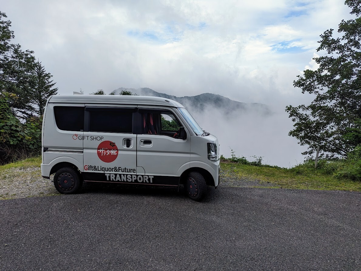 そして、いよいよ林道クライマックス?!?な山王林道へGo…乗用車だと泣きが入るような細い林道だった…すれ違いも出来んじゃないか…な!!そこはスズキエブリィサラダ館号!!防災安全も卓越してる車両です。。。5AGSのミッションも最高に発揮!!いい走りで快走。。。でしたが、横を見ると100mの高さがある断崖絶壁(⊙ω⊙)ヤバッ。。。