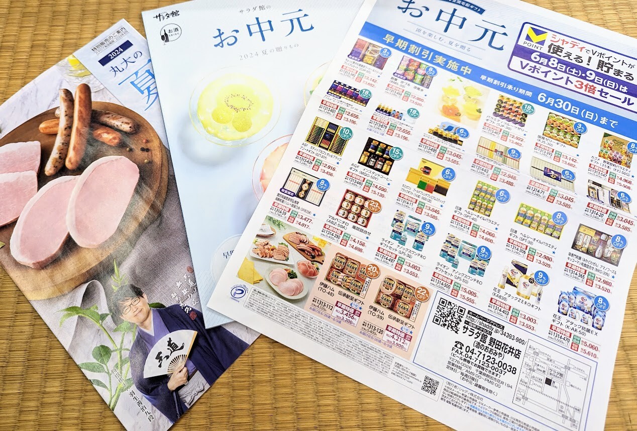 と言うシーズン。。。サラダ館のお中元2024!!カタログ&お得な早期割引チラシのセットアップ完了。。。今年のトレンドは!!今年の夏喜ばれるものは?!の答えがまるまる封入~