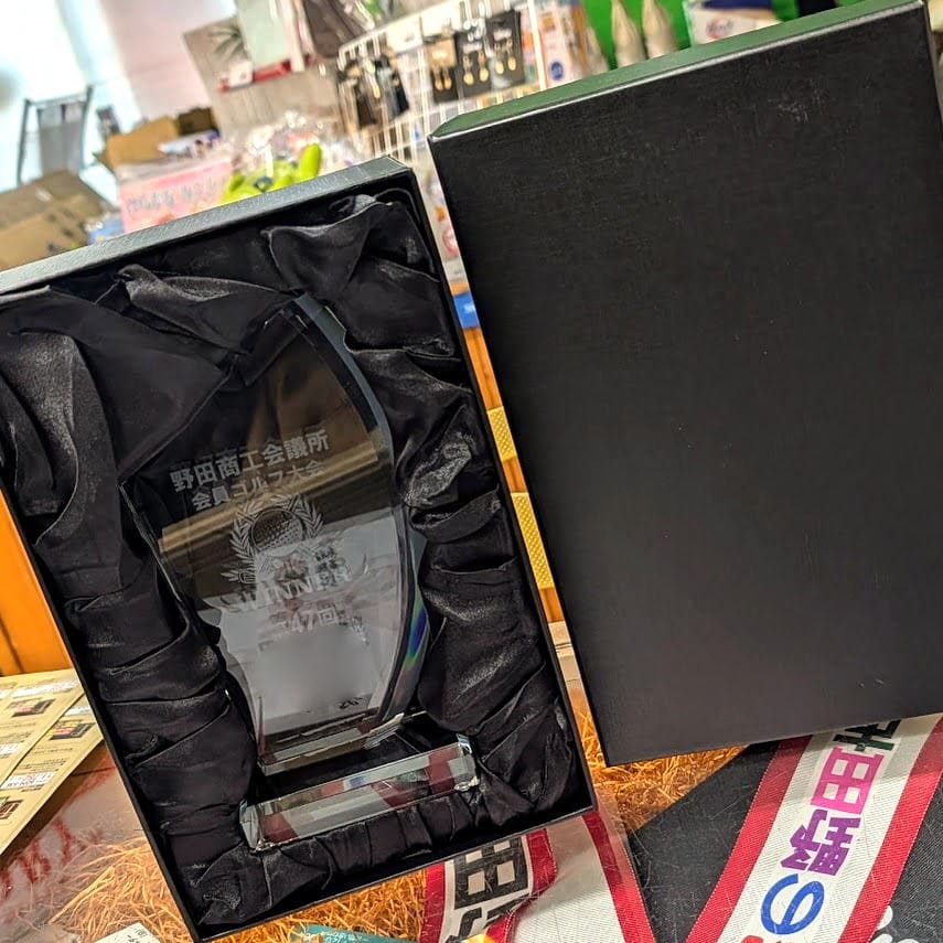 仕上がってきました栄光の証!!の重厚なクリスタルガラスの楯。。。名入れはレーザーによる彫刻で!!ゴルフコンペのマークも鮮明に。。。かなりの重さで、プレミアム感のある仕上げです。。。で、本日配達~
