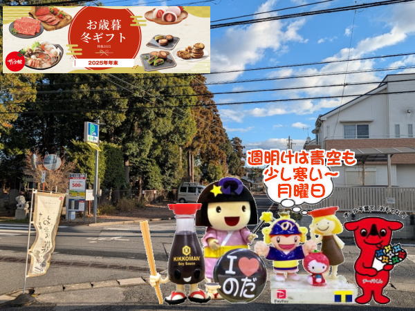 12月下旬の週明け~はお天気も回復して~青空も見えてきて~な野田市の週明け月曜日。。。気温は昨日から比べるとやや寒い~!!昨夜は久々に寝汗かいてて💦気が付けば裸で寝てたし。。。