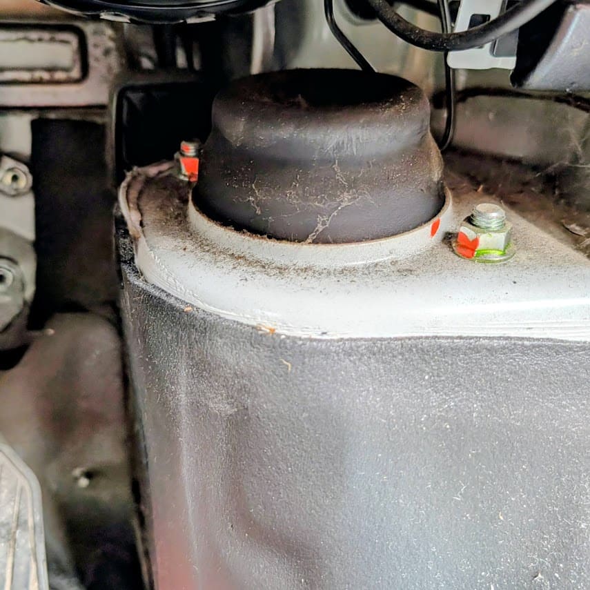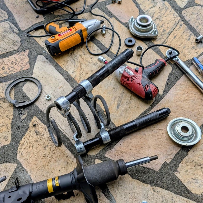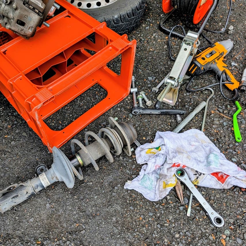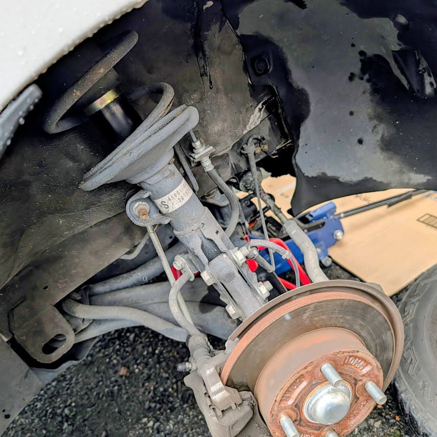 ジャッキアップして、車内に回ってアッパーマウントのボルトを緩めておく~からのフロントタイヤを外して・・・ブレーキアッセンブリなど付属を外していく作業。。。