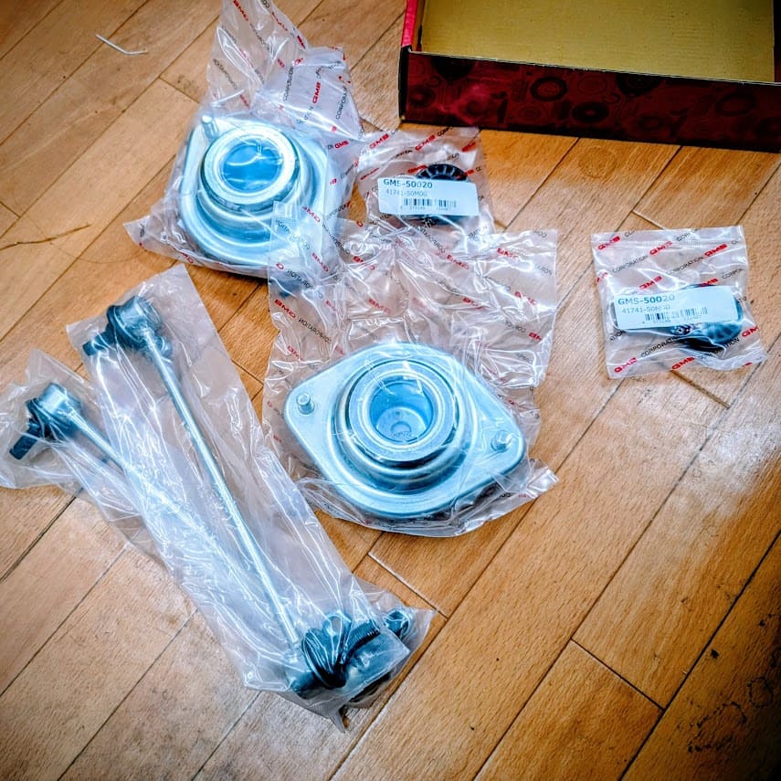 2カ月前から、パーツと消耗品類をポチポチと取り揃え!!モンロー・フロントショックアブソーバーは19800円在庫切れで、約一カ月の時間を要して入荷!!ま~年末年始のお仕事の繁忙期で~お休みも無いので丁度いい。。。せっかく大掛かりな作業なので、スタビライザーリンクも新品に!2本で2600円!アッパーマウントも消耗品で、GMBアッパーマウント4831円で、ストラットベアリング付のMGB社製に・・・だいぶ値段もお手ごろになったスプリングコンプレッサーも3080円~