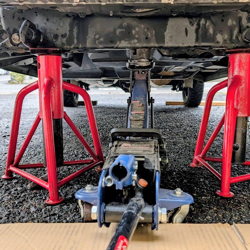 ジャッキアップして、馬を嚙ませて安定させて~いざアッセンブリの取り外し!!ま~ま~固くしまったボルトナットの取り外し~ここで新兵器「エマーソン・ハイブリッドレンチ」の活躍場面です~中々楽々な~但し、スタビライザーリンクの取り外しは、メガネレンチとパンタグラフジャッキで、グイグイと~な力を加えて少しずつ💦で、ようやく取り外し完了💦💦💦