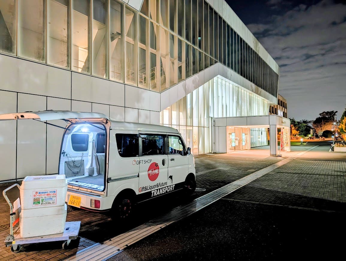 ビール・ハイボールなどのアルコール飲料からお茶・ソフトドリンクなどをキンキンに冷やして~大型クーラーボックスでお届け業務!!配達車エブリィサラダ館号も目いっぱいに積載して~重かった~💦💦💦